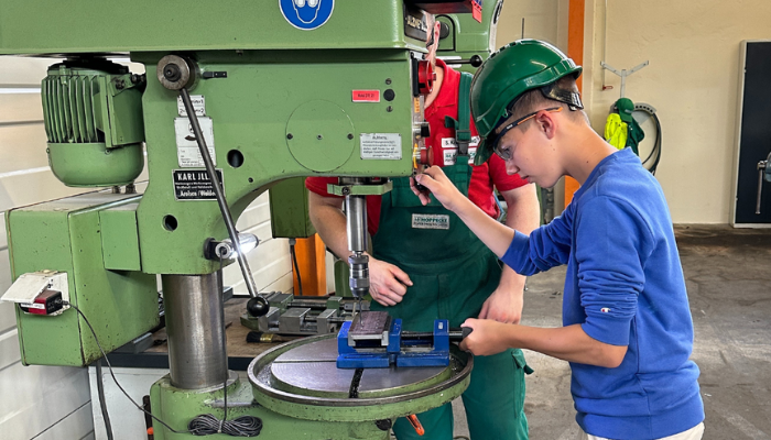 In unserer Lehrwerkstatt konnten die Besucher und Besucherinnen selbst aktiv werden, Maschinen kennenlernen und ihr Können bei spannenden Praxisübungen unter Beweis stellen. Zum Beispiel beim Sandstrahlen, Anreißen, Körnen, Sägen, Bohren und Gewindeschneiden. Die bearbeiteten Bauteile durften die Besucher und Besucherinnen als Erinnerungsstück mit nach Hause nehmen.